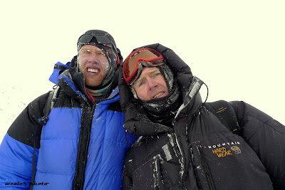 After a rest day at C2, we headed for the top. Dave K and Dave C take the final steps to the summit. The South Face drops off in the background to the left.