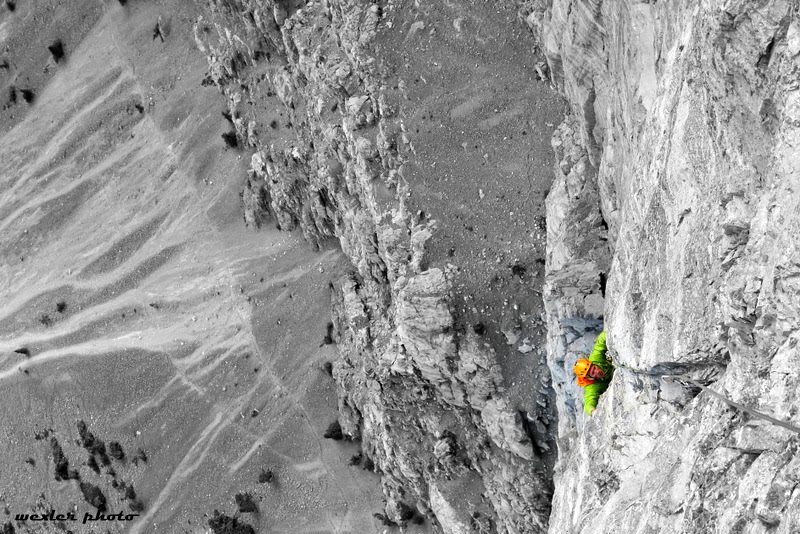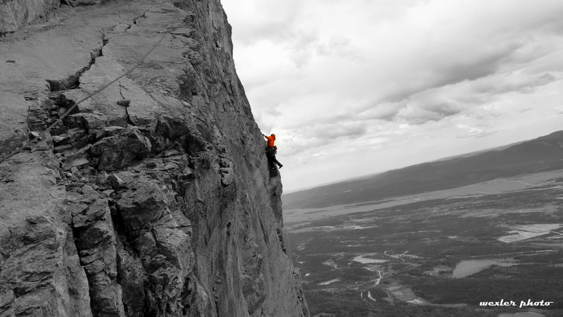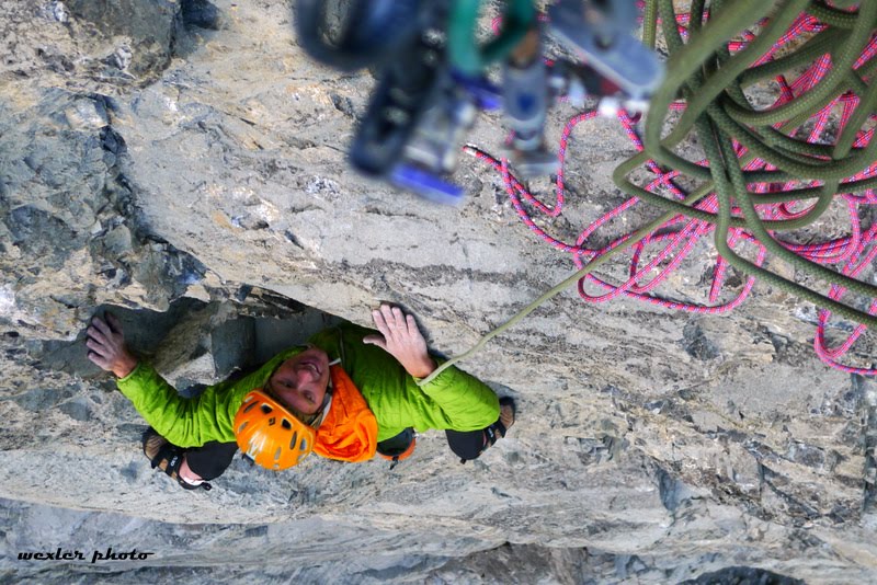 Starting the final pitch to the top. Jesse stepped up and linked pitches 6 and 7 with a 70 meter rope.