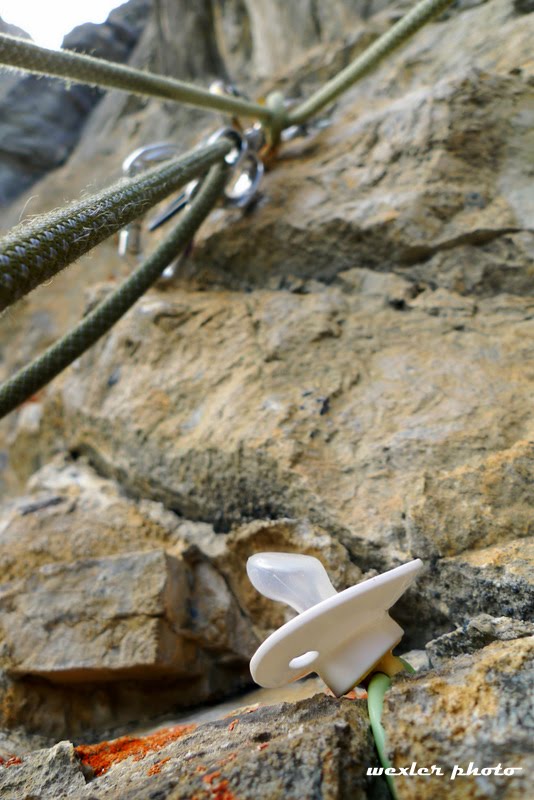 Someone was kind enough to leave a pacifier at the top of the crux 5.11 b/c pitch.