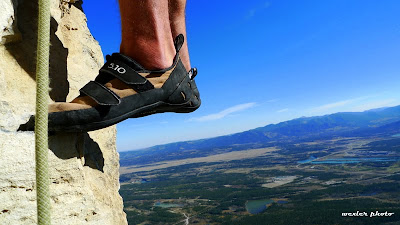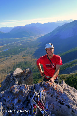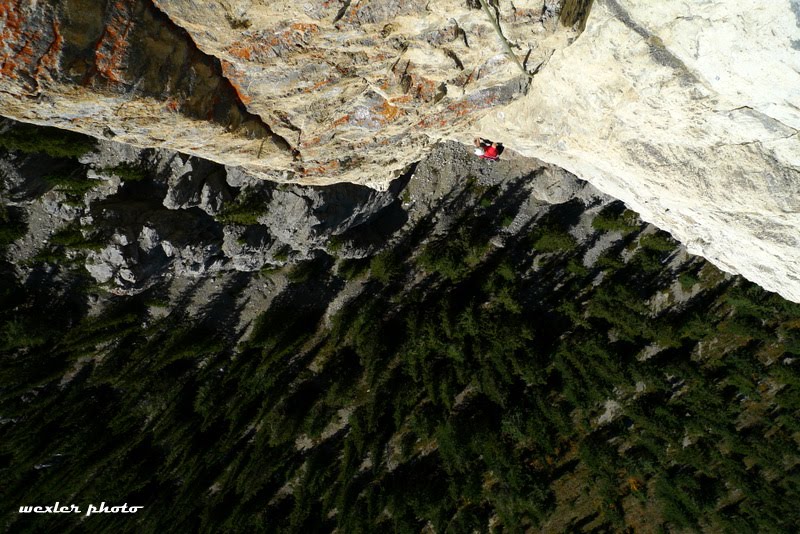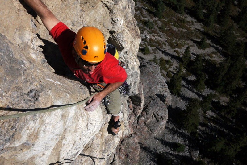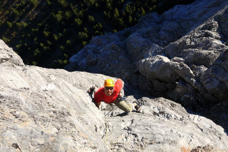 Lots of air beneath Josh’s feet on the 5.11a fifth pitch of Yamnuska’s East End Boys.