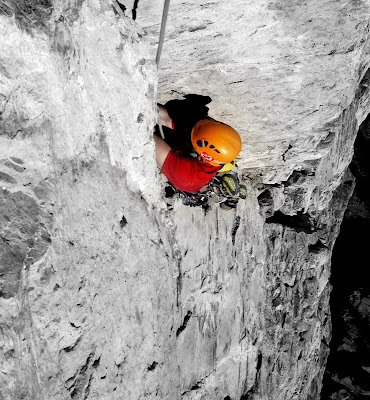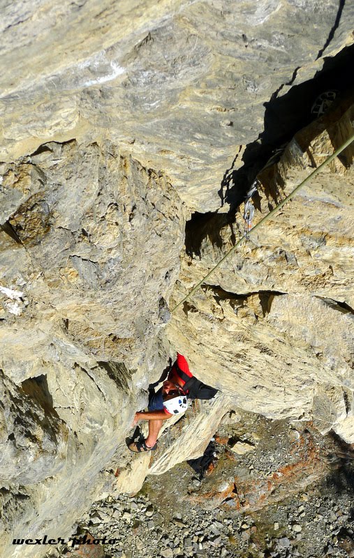 Josh could not bear the thought of spending any more time at the hanging roof belay and insisted on taking the roof pitch.