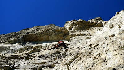 Looking down at Josh as he moves through the 12a boulder problem crux on pitch 3. From the belay, you can basically clip 3 bolts. This eliminates any fear factor and makes it quite an onsightable pitch for cowards like myself.