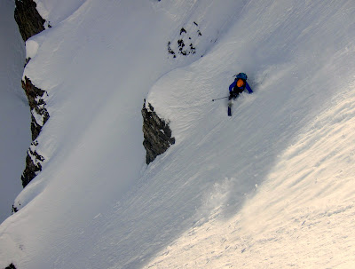 Had a great enviro ski day yesterday with Gery U and Steve H. In an attempt to keep our carbon footprint low, we decided on an objective right above town. This made us feel good because we were saving the environment, but more importantly, because we could gesture wildly at the cool line from numerous downtown patios.