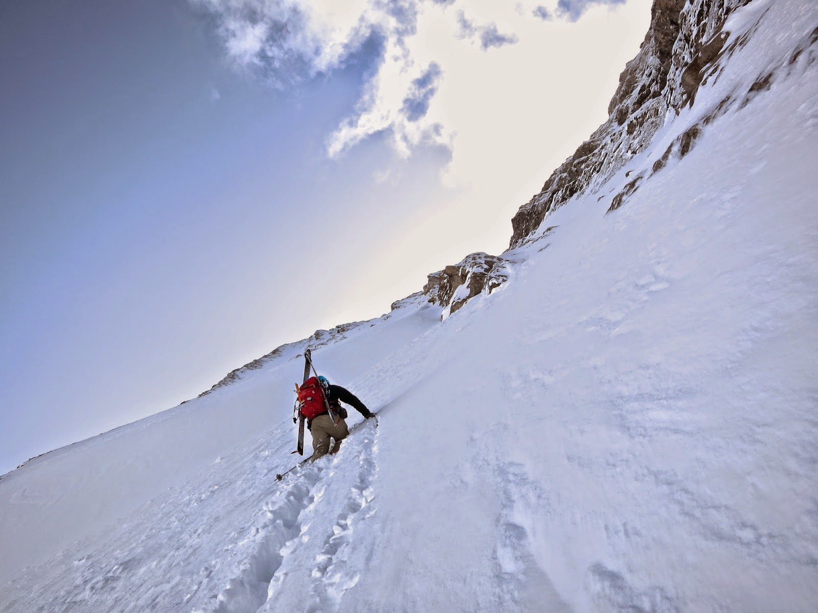 Gery heading up the endless slope to the summit ridge. Conditions were about as good as they get with boot-top to waist deep snow and minimal sluffing.